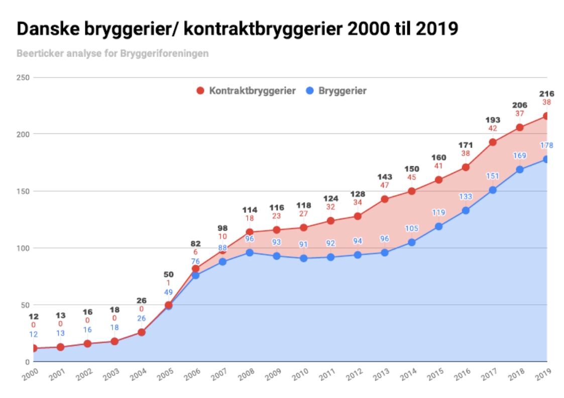 Innovative danske øl-folk har fortsat mod på at åbne nye bryggerier. Ved årtusindeskiftet var der kun 12 danske bryggerivirksomheder, men siden 2003 har antallet af bryggerier udviklet sig eksplosivt – lige bortset fra årene med finanskrisen. Og i løbet af 2019 har optimistiske bryggere sat varme under kedlerne i ti nye bryggerier netto, så det samlede antal aktive danske bryggerier nu er oppe på 216.
